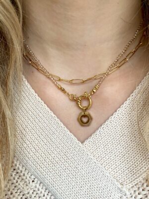 De lengte van de ketting is 40 cm en hij wordt geleverd met een ringetje en een (ronde) sluiting.